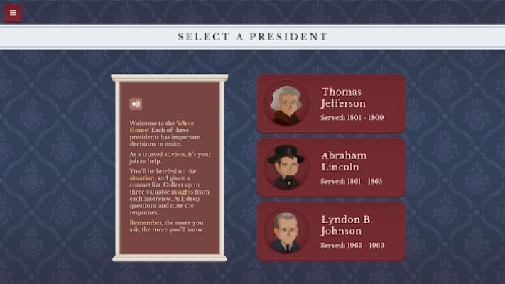 -Select from three presidencies: Thomas Jefferson, Abraham Lincoln, and Lyndon B. Johnson