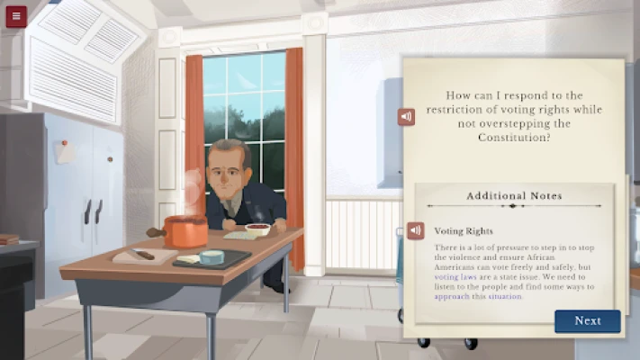 Take on the job of advising the president through historical challenges by talking to people in and around the White House. Consult with confidants within the White House and use evidence-based reasoning to provide the president with counsel.